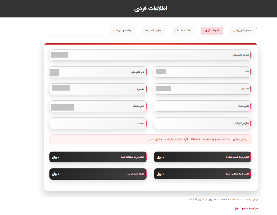 همان طور که در تصویر زیر می بینید باید فرم را به صورت کامل پر کنید و توجه داشته باشید که کدملی و شماره تماس شما باید با فرم آموزشی که جهت ثبت نام پر کردید یکسان باشد.